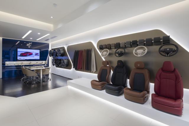 インテリアレザー、ウッドパネルなどマセラティモデルの多彩なパーソナリゼーションアイテムを展示した「コンフィギュレーションエリア」も設置し、お客様のご希望に応じたマセラティをご提案いたします。